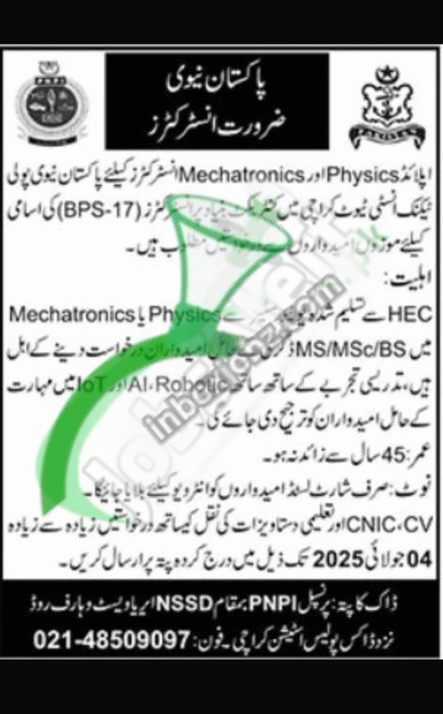 For all those employment seekers, here is a brilliant job offer being advertised from Pak Navy Civilian Instructor Jobs 2025 Instructor Latest Vacancies Advertisement. Pakistan Navy Polytechnic Institute Karachi is seeking to hire adroit, caliber, well-educated applicants who are required to fill the government jobs named (Instructor Mechatronics (BPS-17), Instructor Physics (BPS-17)). The vacancy is required to be filled by the applicants as soon as possible at the Pakistan Navy Polytechnic Institute, Karachi. An appointment will be made on a contract basis. It is a brilliant career opportunity to apply for it as soon as possible. Now, I will let you know about its further details below.